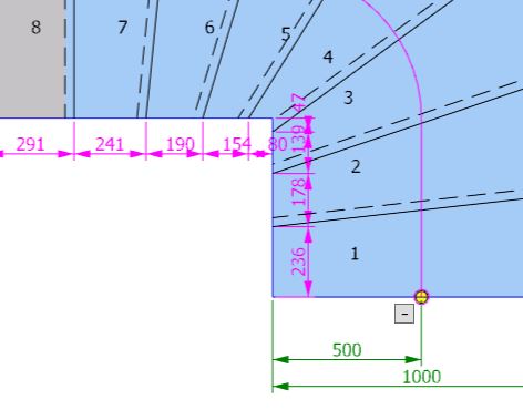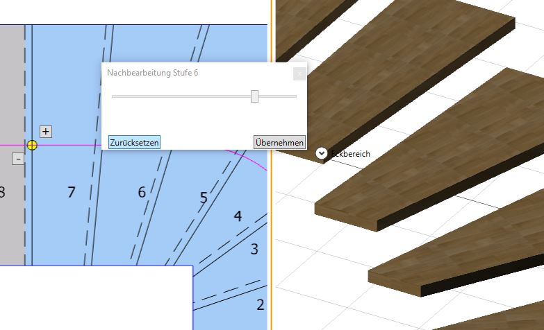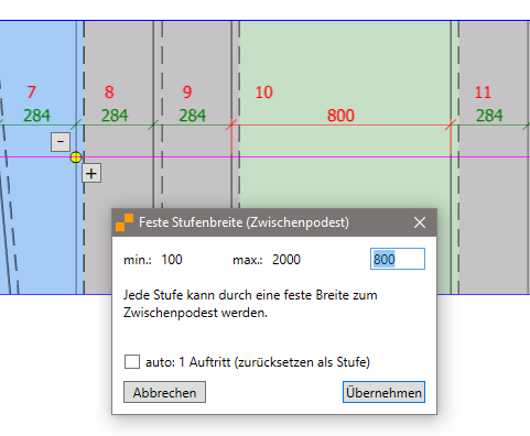 | Elke trede kan in zijn breedte afwijken van de automatisch berekende uitstekende trede en krijgt een bepaalde waarde toegewezen. Op die manier kunnen tussenpodesten worden ingericht. |